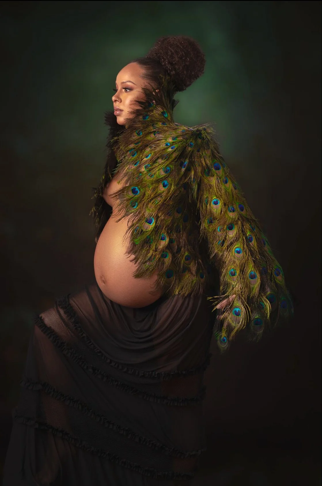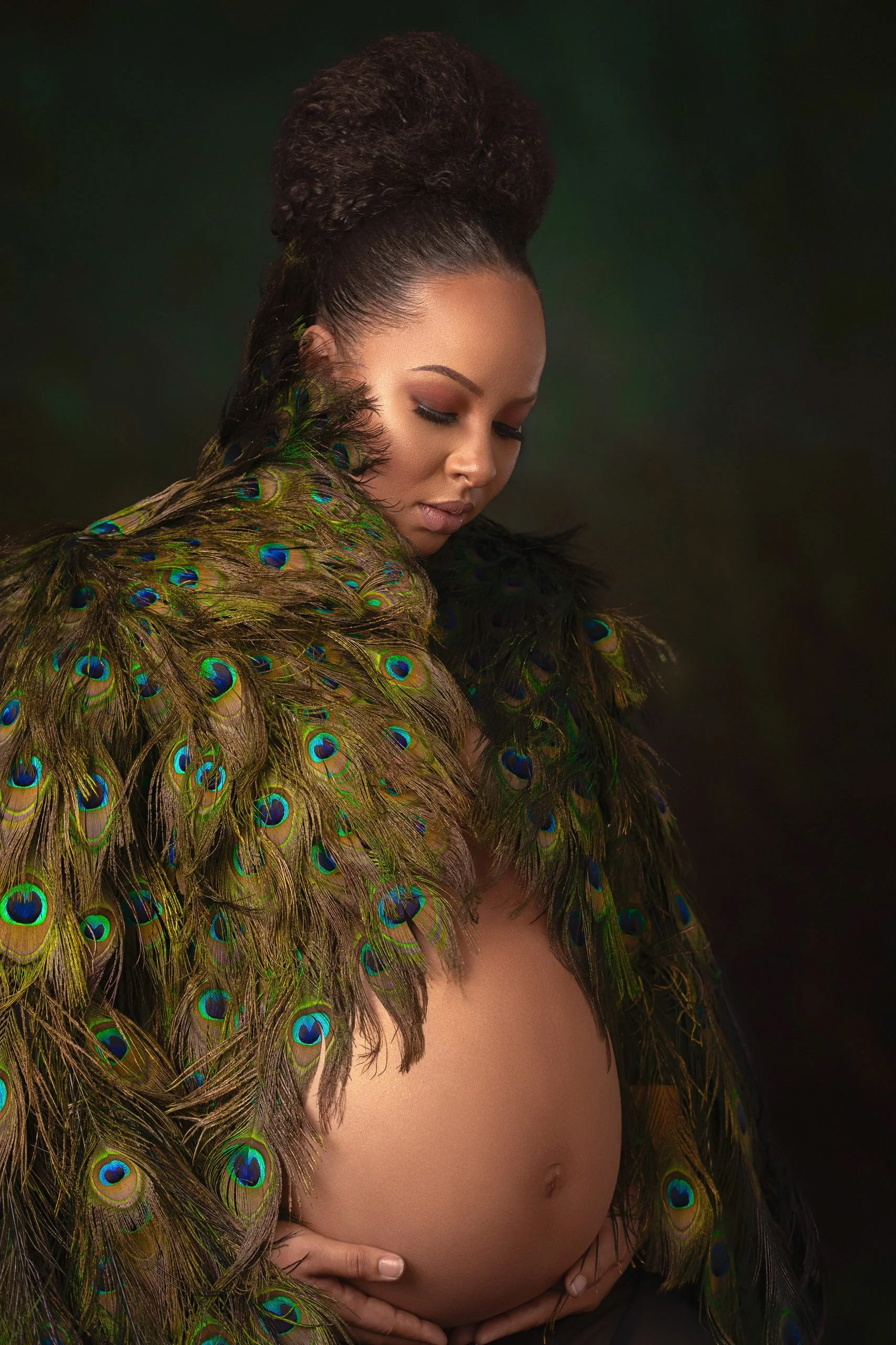 This peacock maternity session is one of those stories. It is a reminder that motherhood is a masterpiece. That the divine feminine is alive in every curve and every breath. And that when women create together — whether through motherhood or through art — something truly magical emerges.